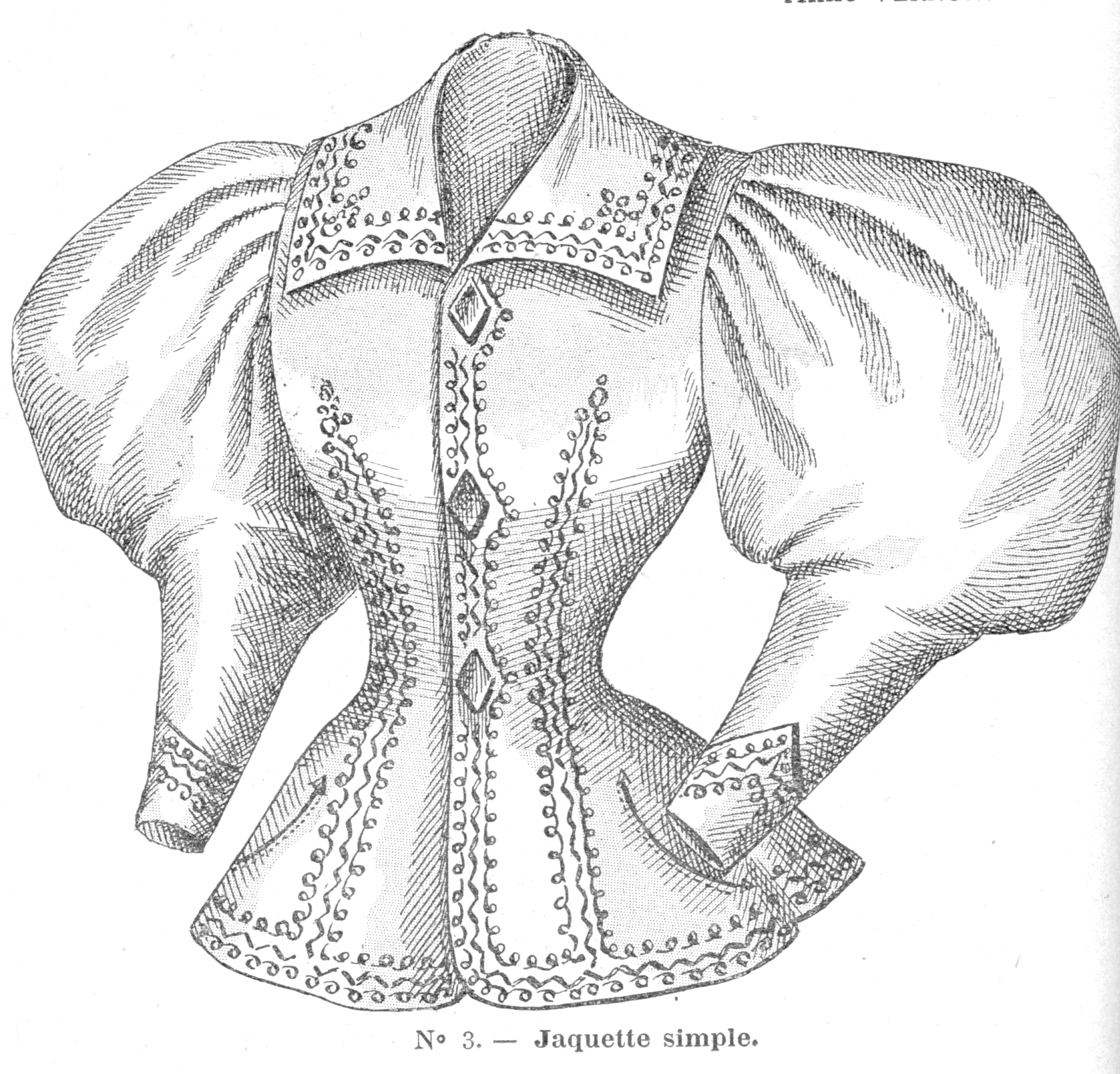 Jaquette simple, fermée devant å l'aide de boutons artistiques. Ornée de passementerie, elle a un col carré et des manches trés amples avec revers brodés.
