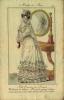 Chapeaux de gros dété ornés de rubans de gaze et d'épis de maïs du magasin de Mme Jardin, Passage Vivienn. Redingotes de gros d'été garnies de ruches boiteuses. Fichu de blonde.