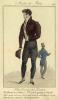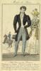 Redingote à colet de velours, revers craoisant, boutons bonbés et faconés en or et poches en travers, doubles gilets de piqué. Pentalon de Casimire agrafé sur le devant et boutonné en bas, Cravate à mille raies.